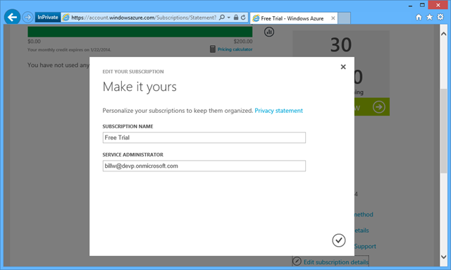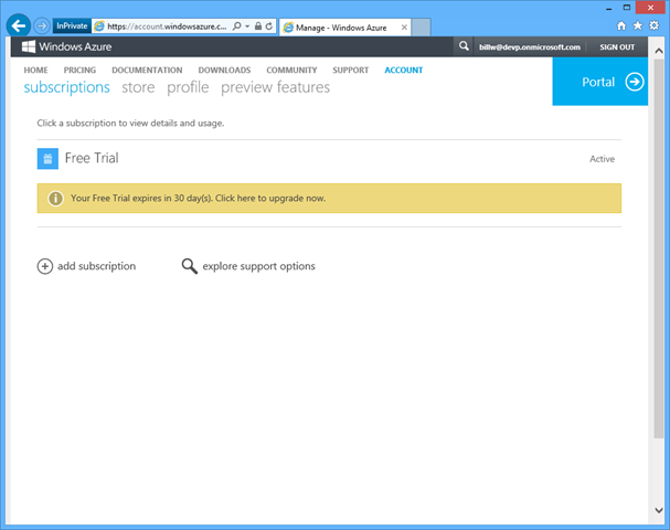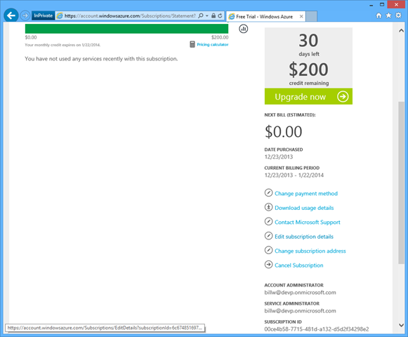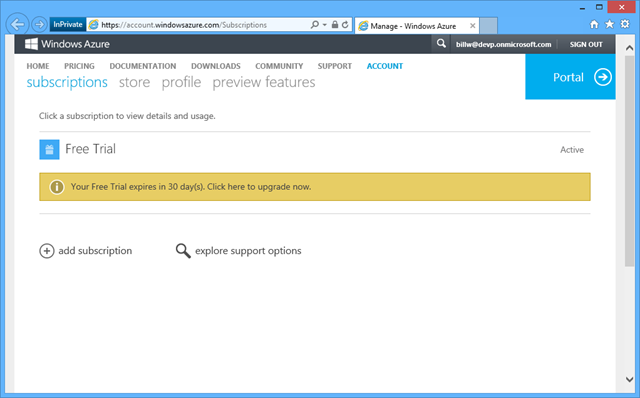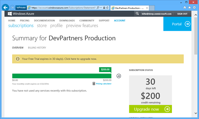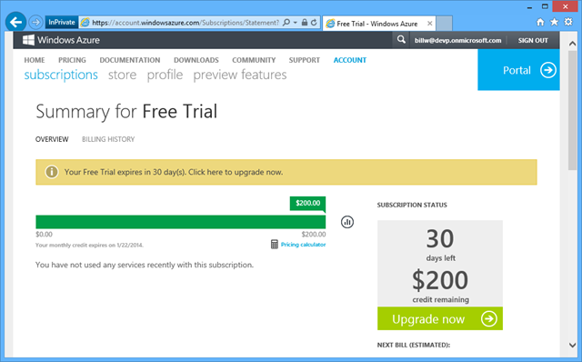 This means that your monthly bill will draw from this balance before you incur actual costs. You can also choose to configure the account to not allow overages, such that when your monthly allotment is exhausted, consumption stops. This way you know your credit card will not be charged. You can selectively re-enable it for the rest of the month. This is not a bad default setting to avoid runaway dev-test costs due to forgetting to turn off resources when you didn’t need them.